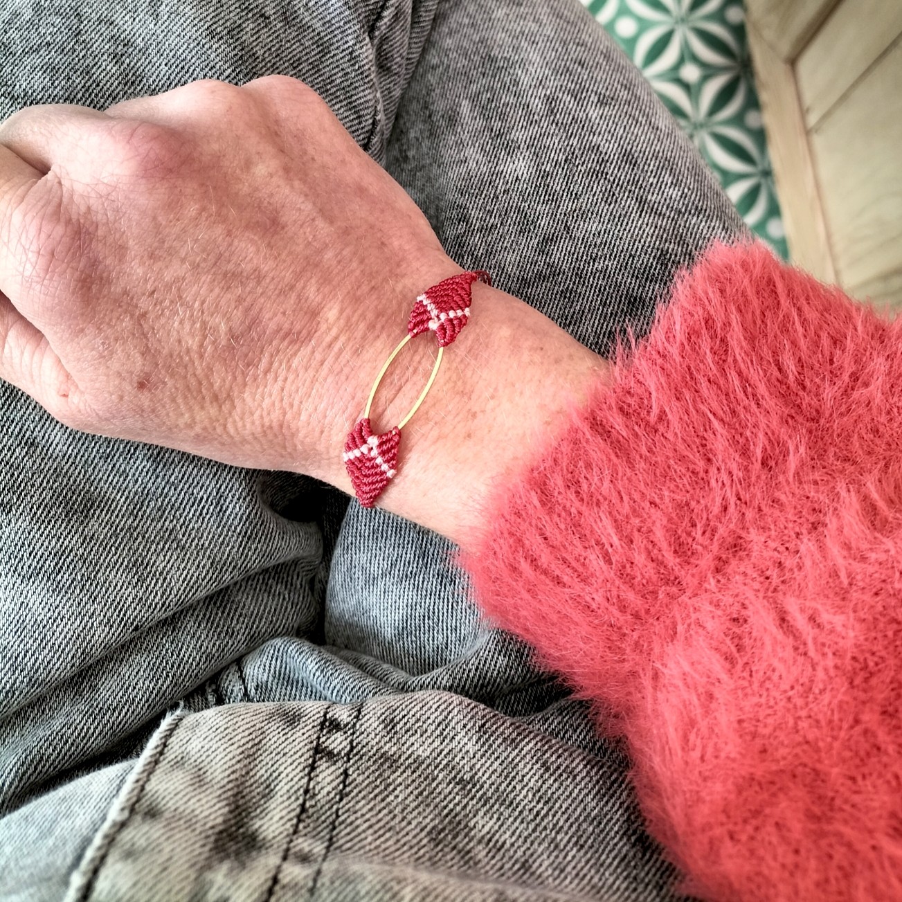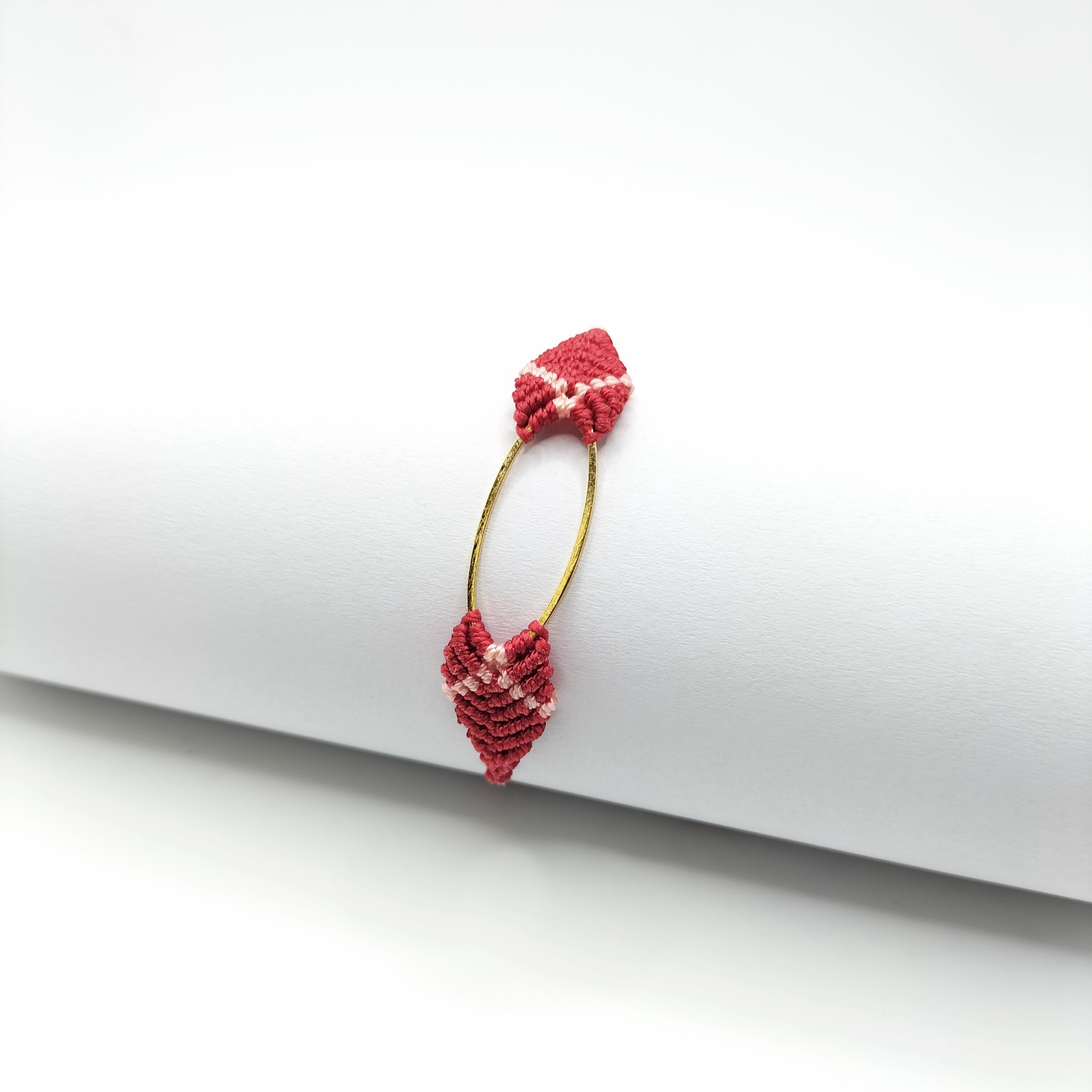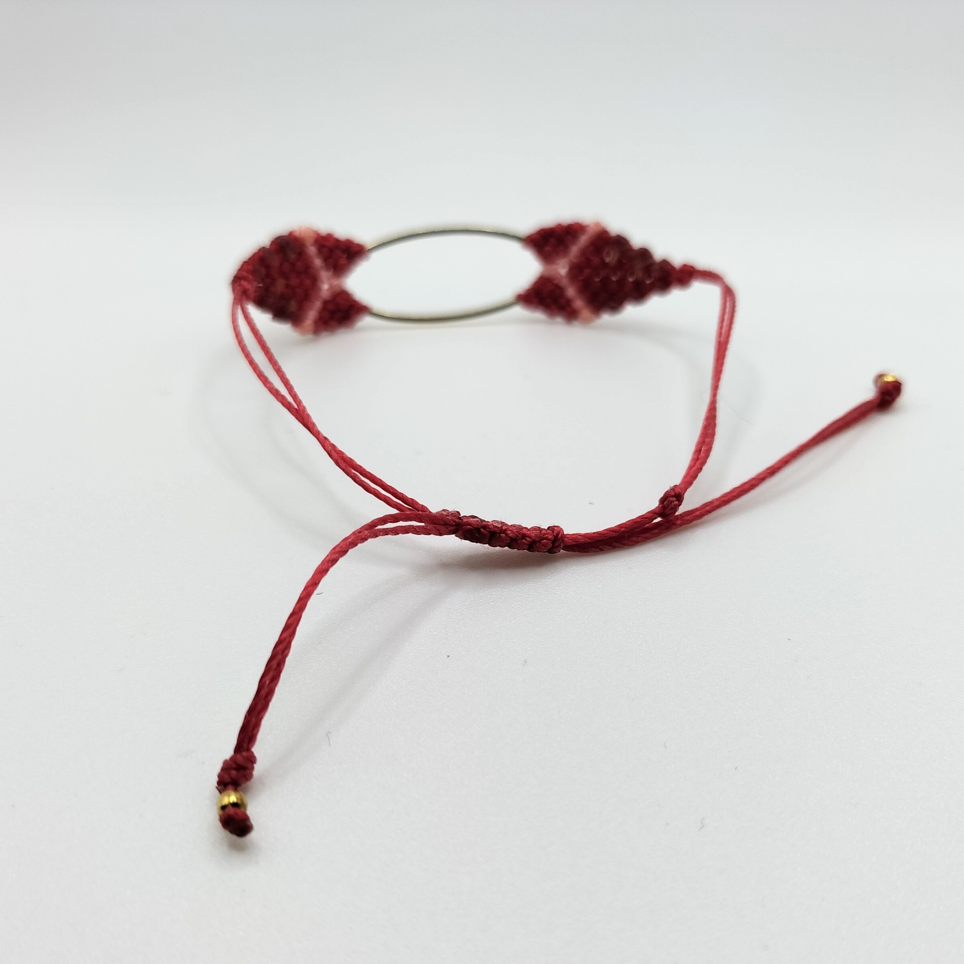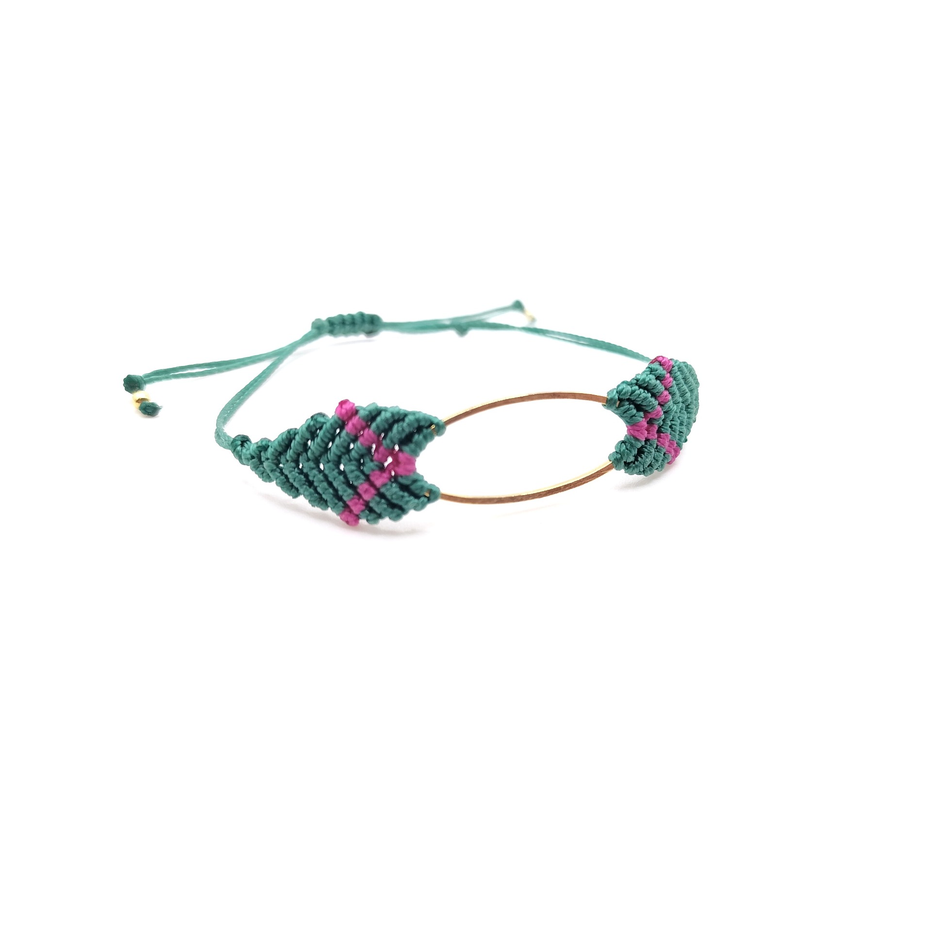 Bracelet en macramé tissé à la main avec un petit ovale en laiton doré à l'or fin 24 carats par Noua Original La Rochelle.
