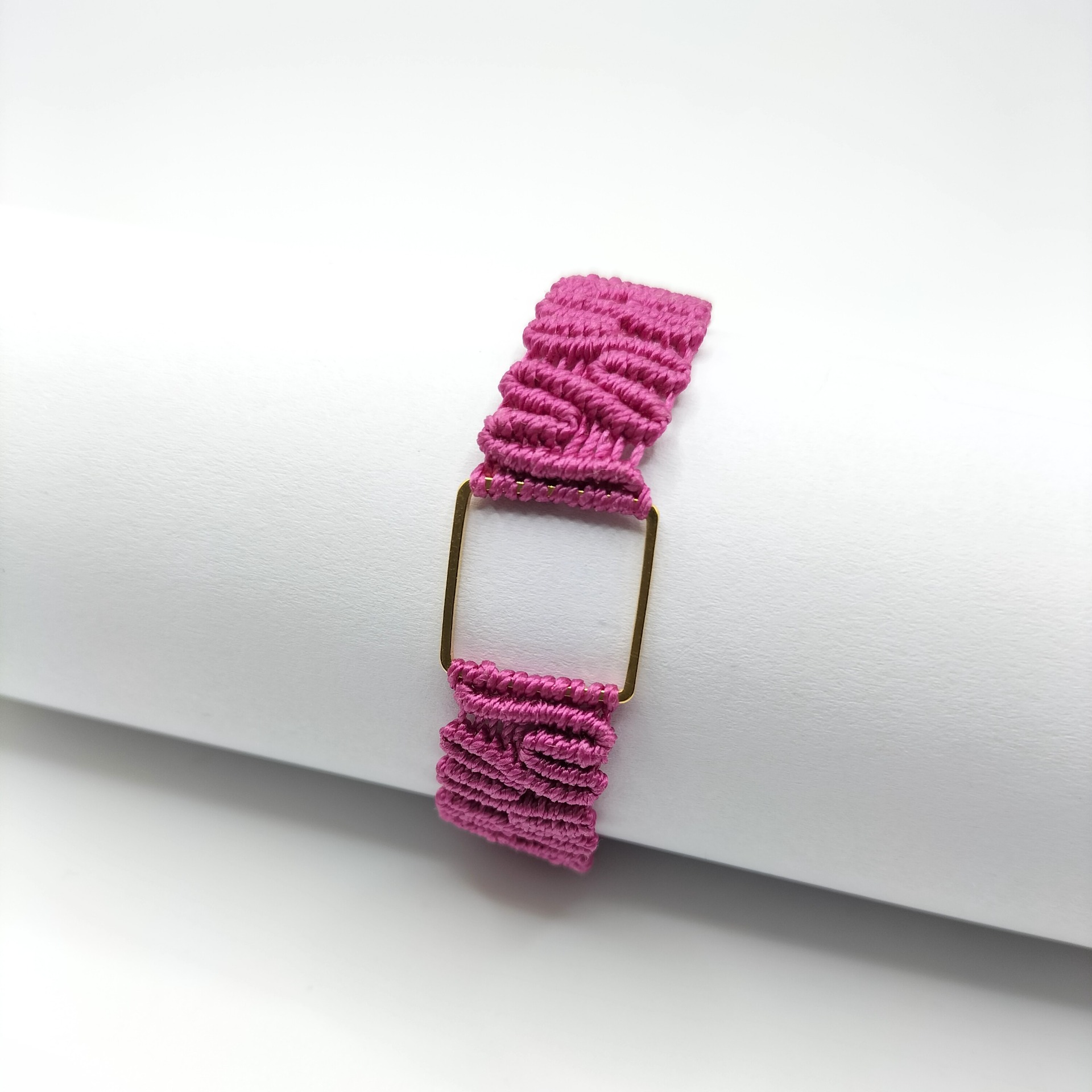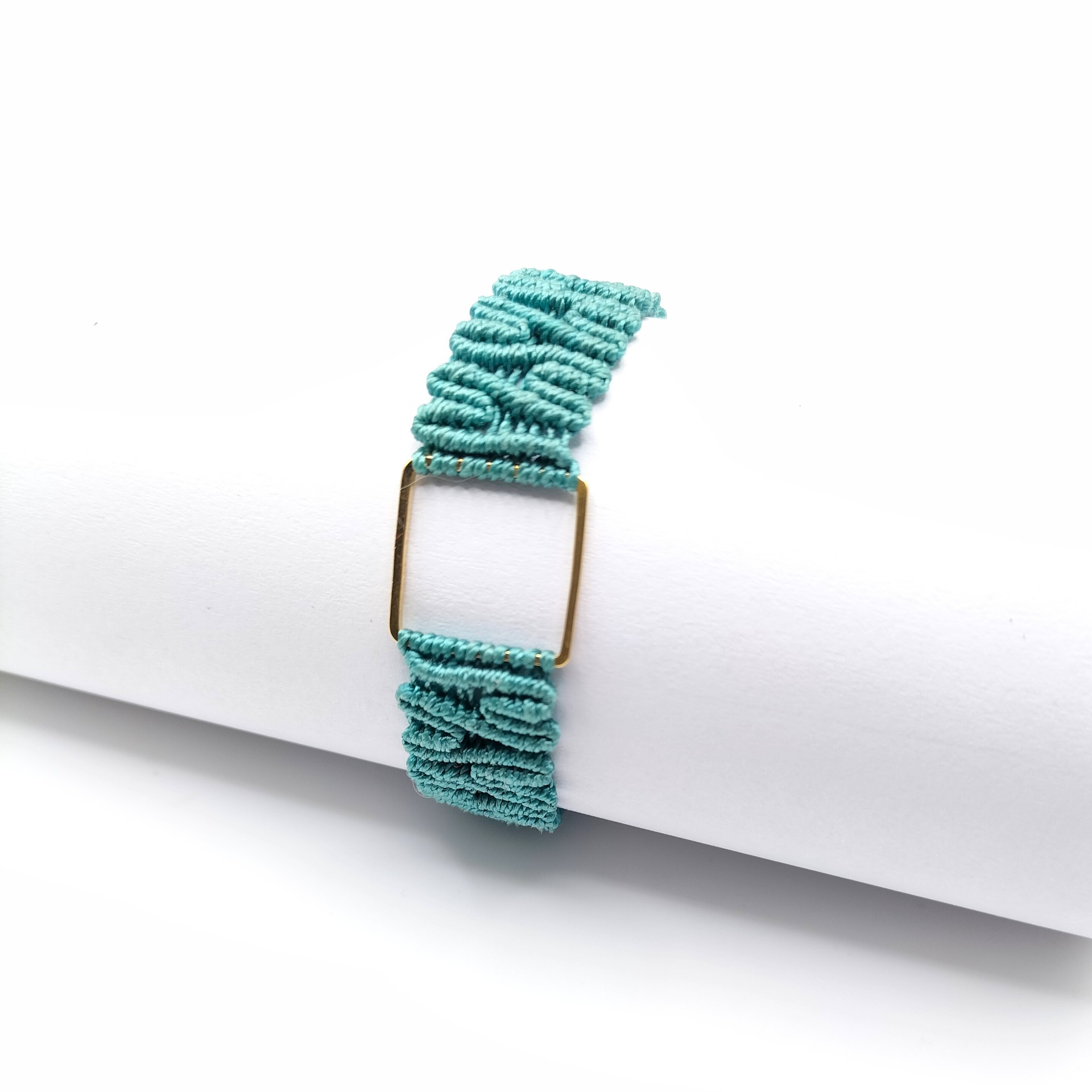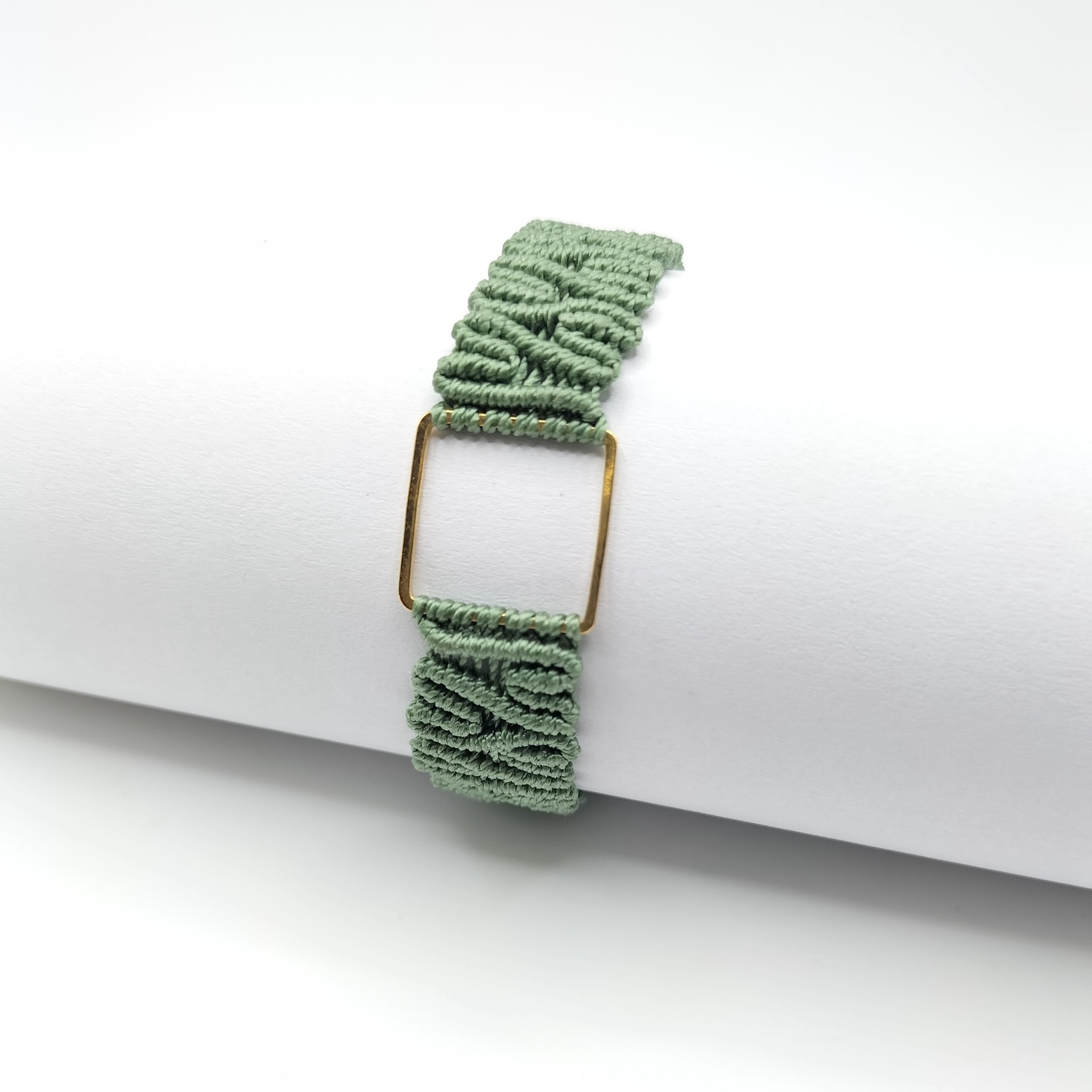 Bracelet manchette en macramé tissé à la main par Nouaj avec une estampe carrée au centre en laiton doré à l'or fin 24 carats à Paris.