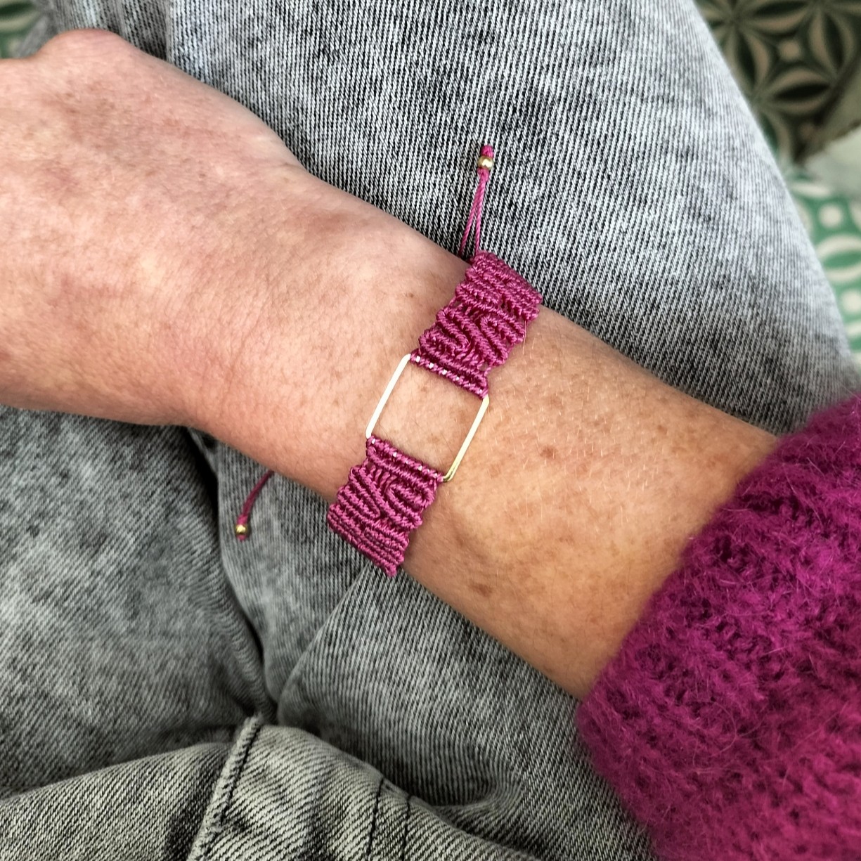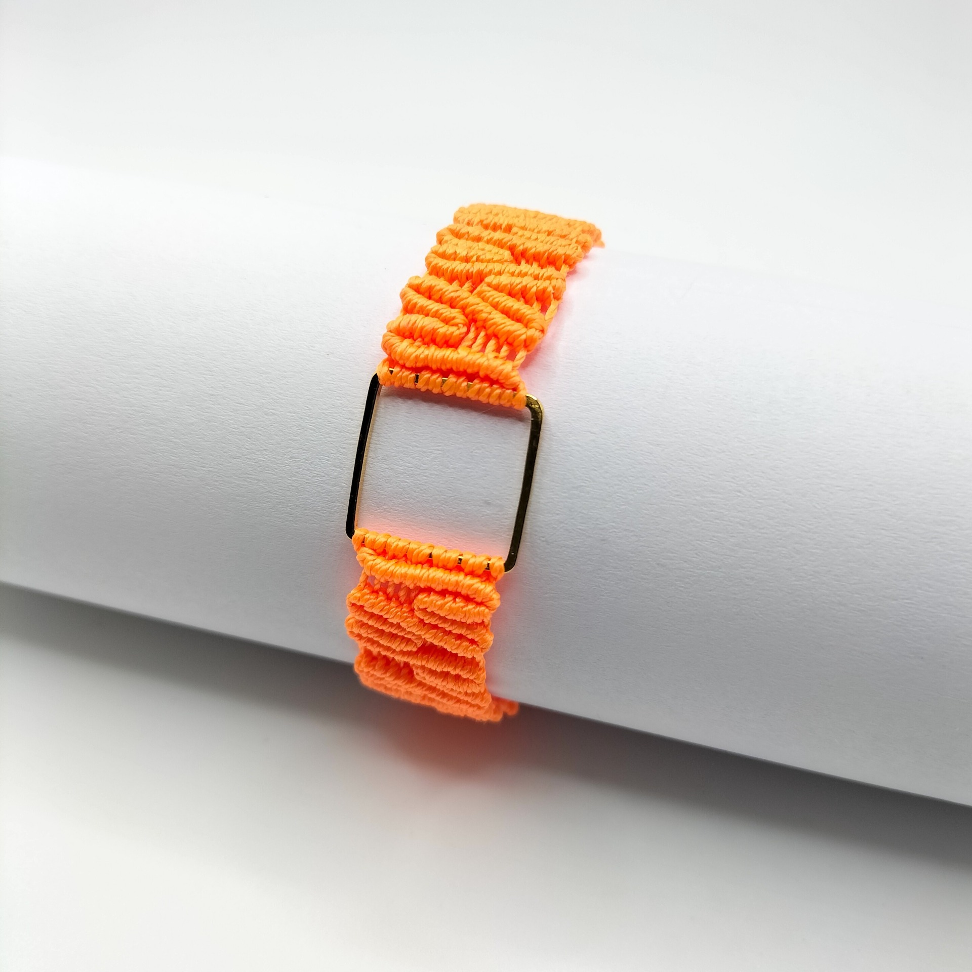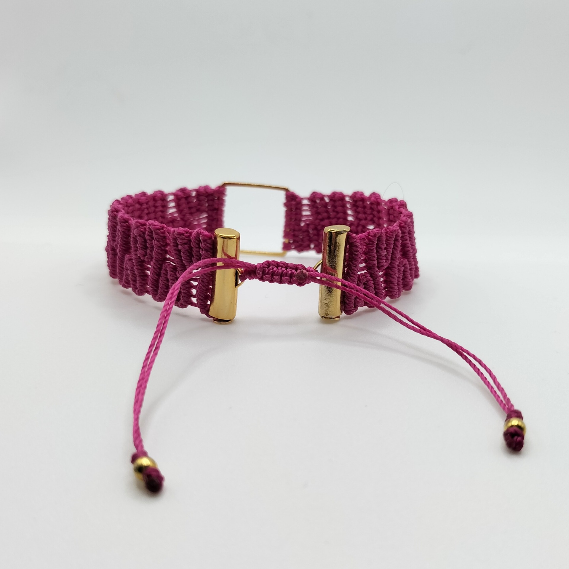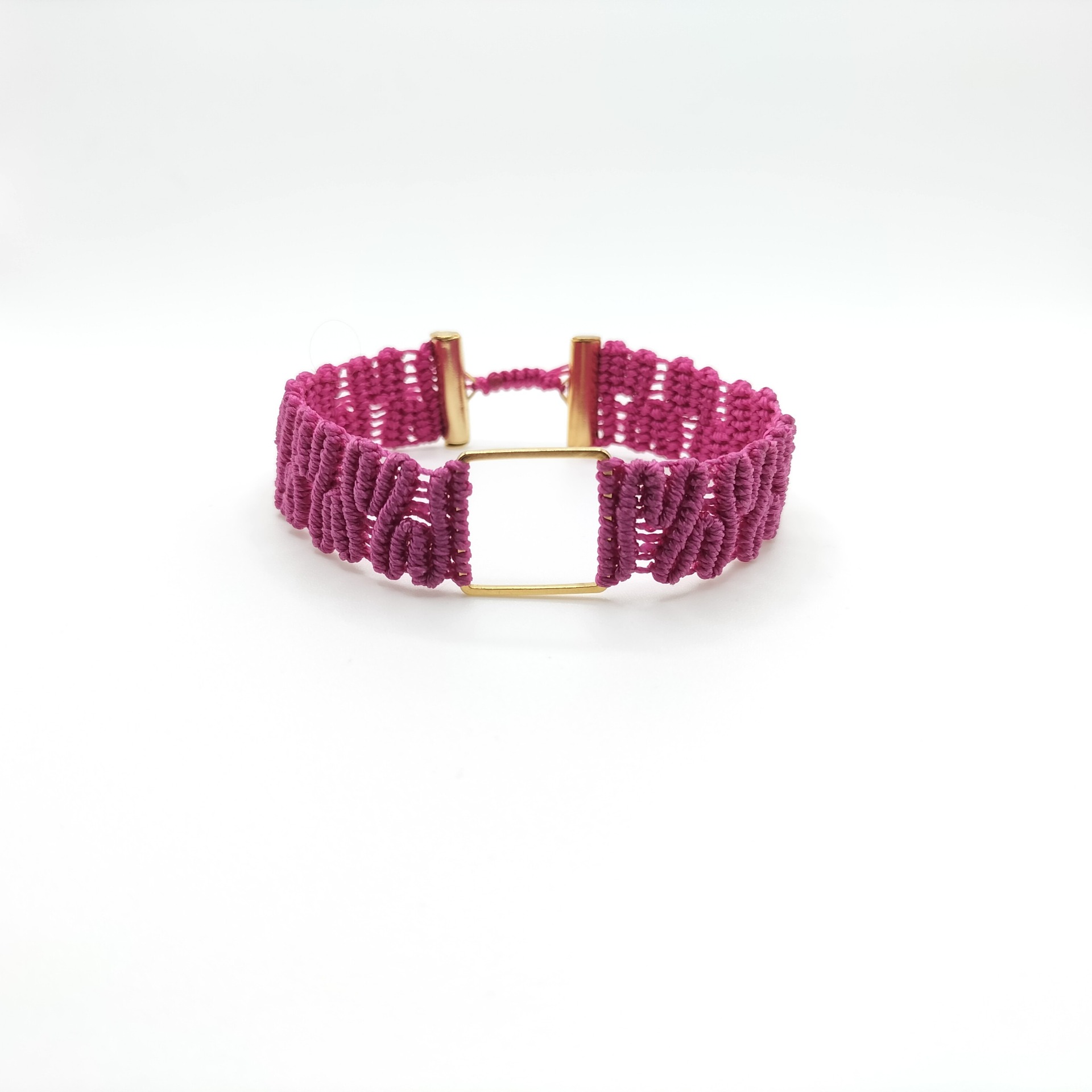 Bracelet manchette en macramé tissé à la main par Nouaj avec une estampe carrée au centre en laiton doré à l'or fin 24 carats à Paris.