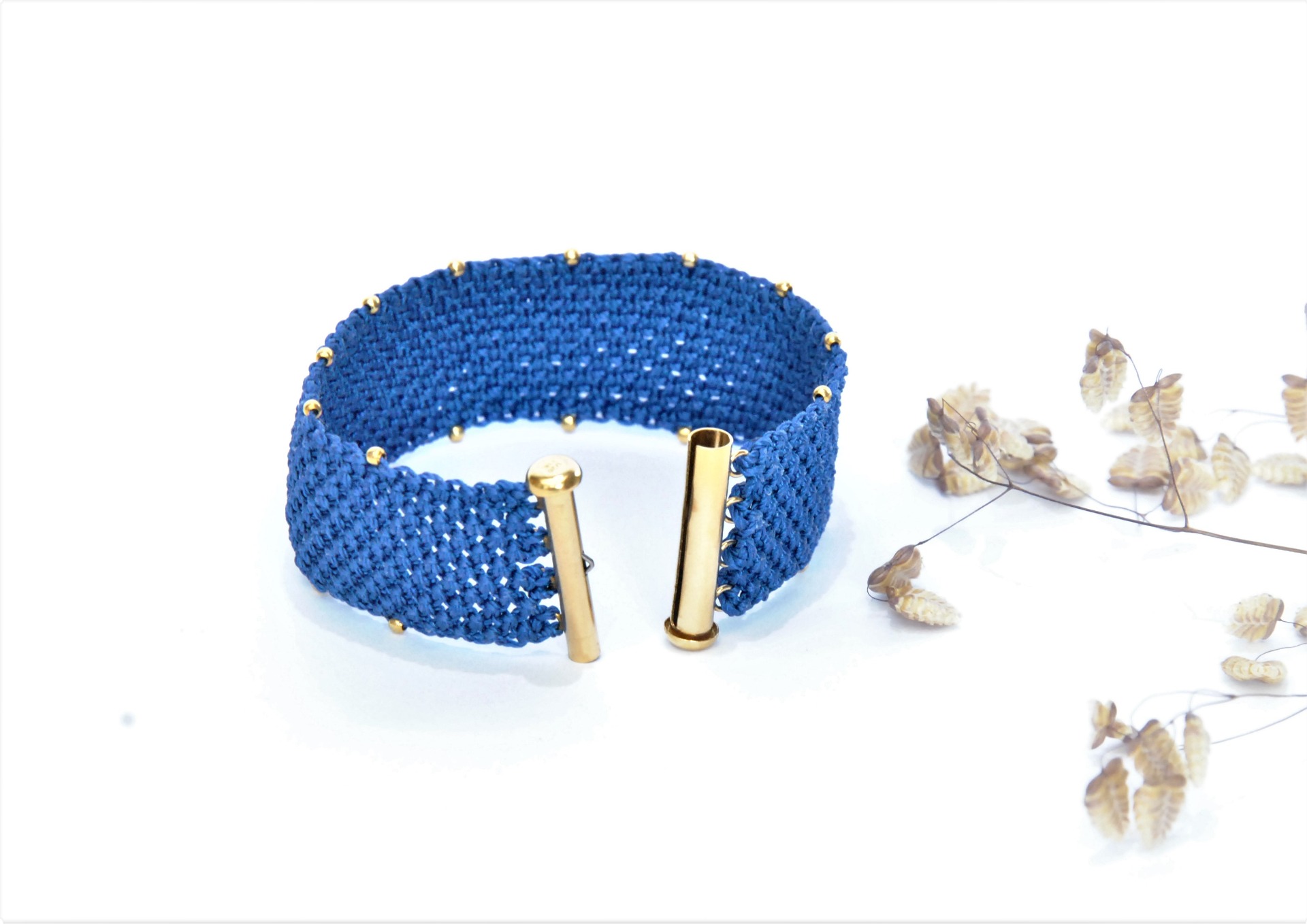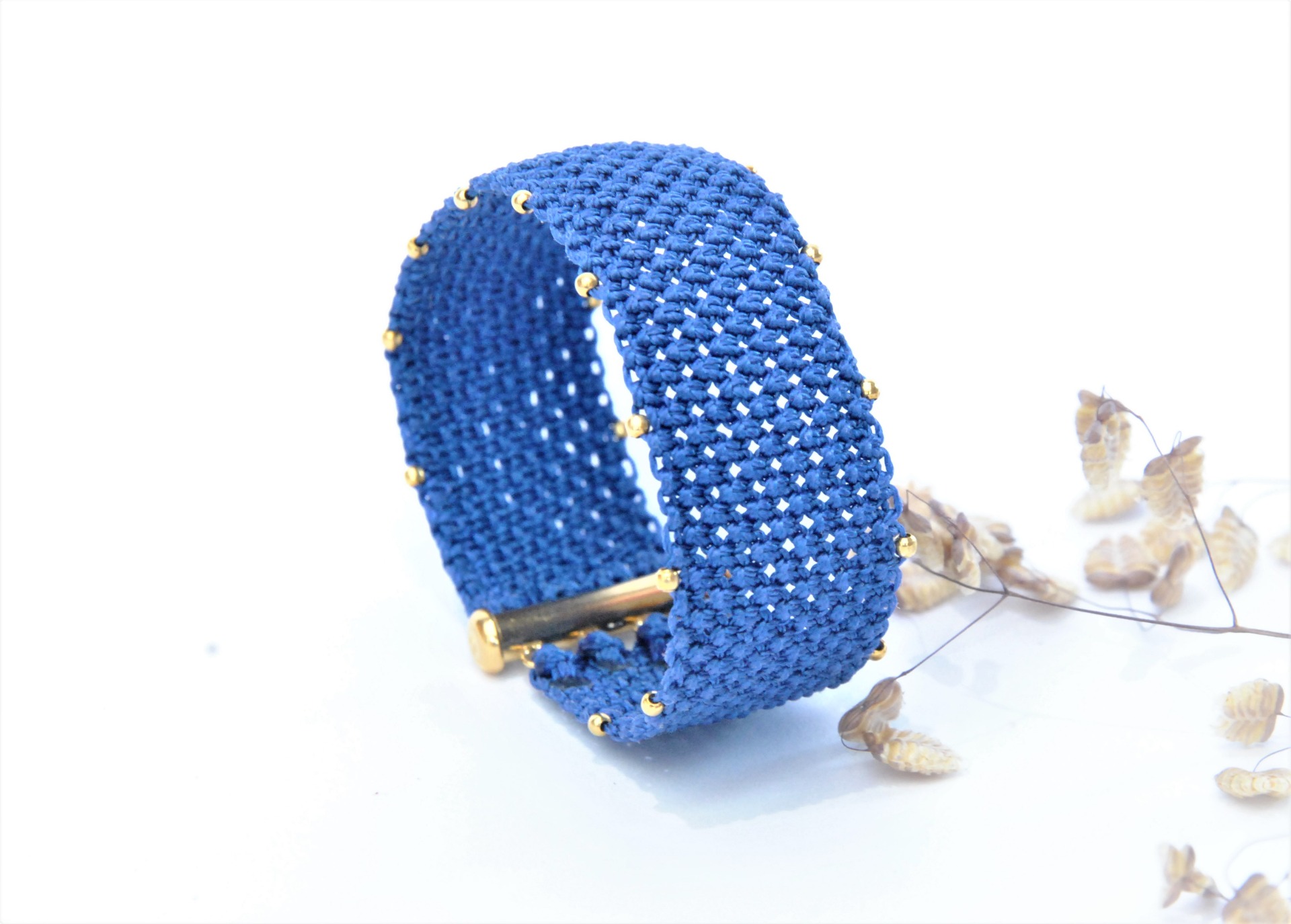 Bracelet en macramé tissé à la main avec fermoir en laiton doré à l'or fin 24 carats.